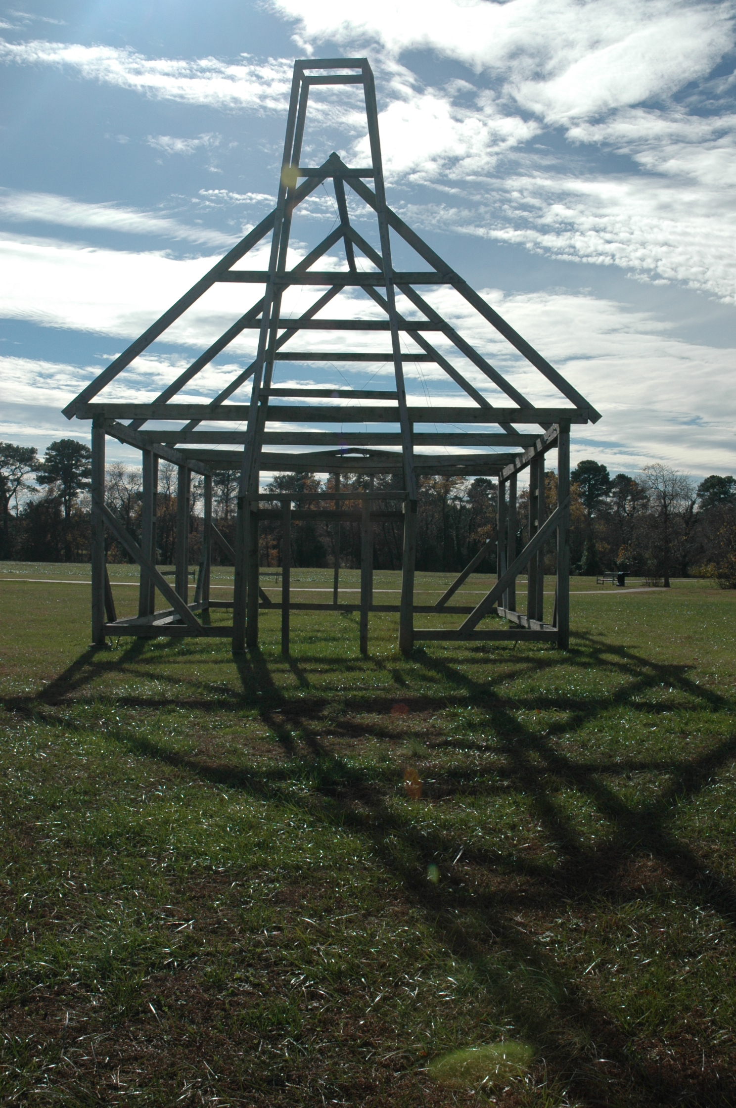 As you may have guessed from the photo, “ghost frames” have been erected on the foundations of a few other buildings, to show their exact location and approximate height and shape. That tall structure on the ghost frame, by the way, isn’t a tower or steeple, but a chimney. We almost missed getting a photo of a reconstructed chimney, but in the next photo you can see one on the left margin. As you see, they weren’t built of brick, but of “wattle and daub”–dried mud over a wooden frame.