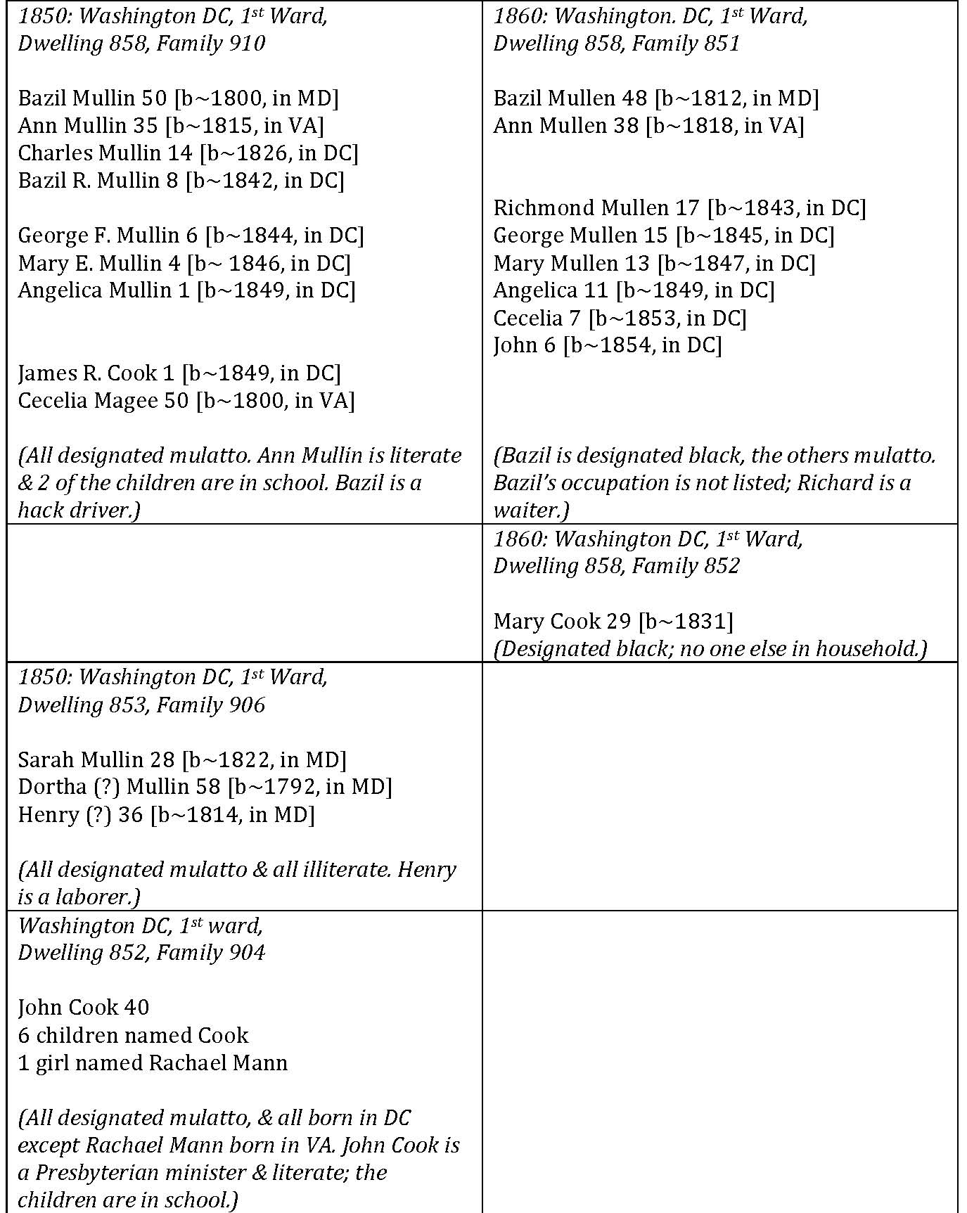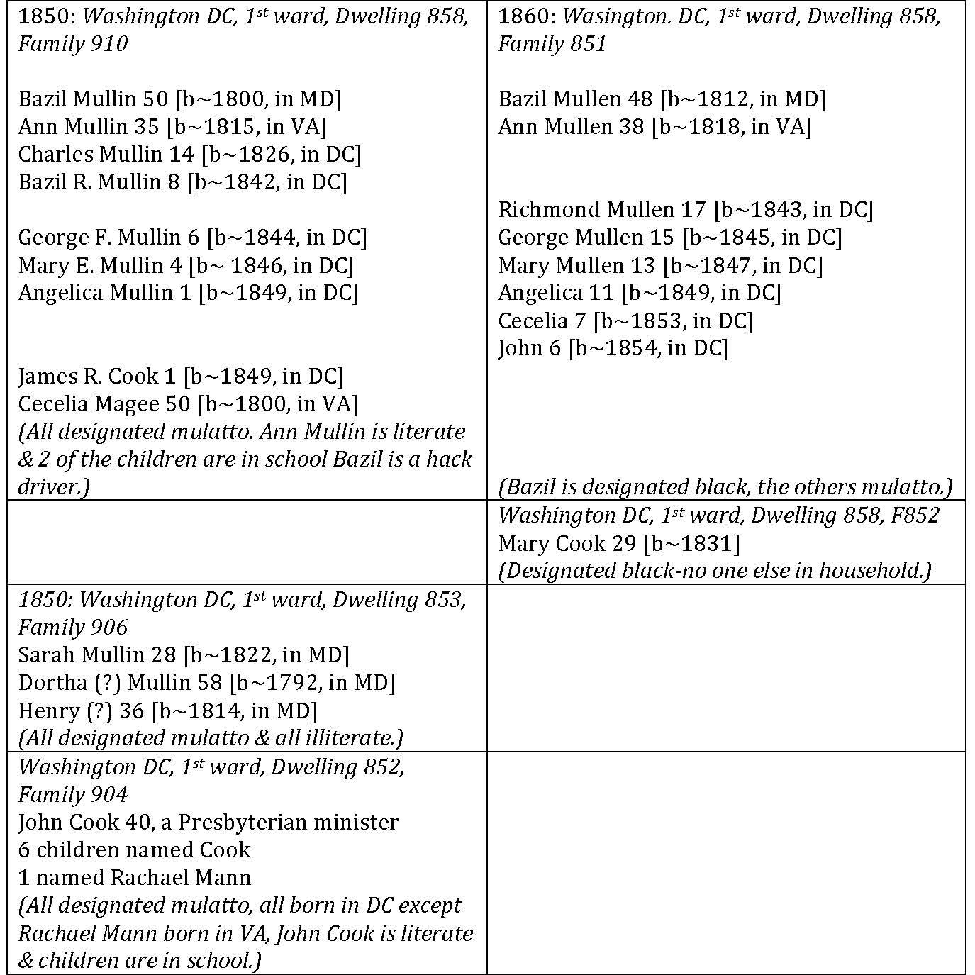 By 1850, when the census began providing names and ages for all members of the household, there is no record for Joseph & Cate, nor for Basil (I). Here is a comparison of the Washington D.C. households of Bazil Mullin (II?), Sarah & Henry Mullin, and for others who seem to be related.