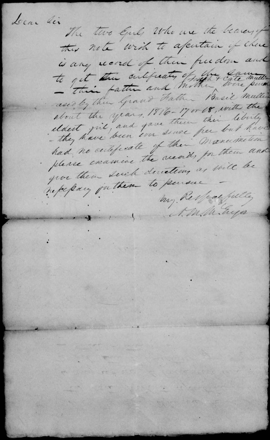 On 4 November 1846, the Prince George’s County Court recorded a note received from Nathaniel M. McGregor regarding the free status of two unnamed girls, daughters of Joseph and Cate Mullin, and granddaughters of Basil Mullin.
