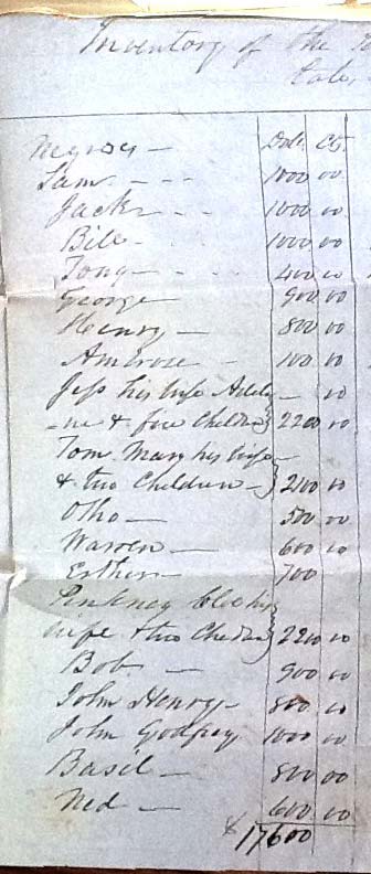Sam (1000), Jack (1000), Bill (1000), Tony (400), George (900), Henry (800), Ambrose (100), Jeff, his wife Adeline & five children (2100), Tom, Mary his wife & two children (2200), Otho (500), Warren (600), Esther (700), Pinkney, [Cloe? Clara?] his wife & two children (2200), Bob (900), John Henry (800), John Godfrey (1000), Basil (800), Ned (600)
